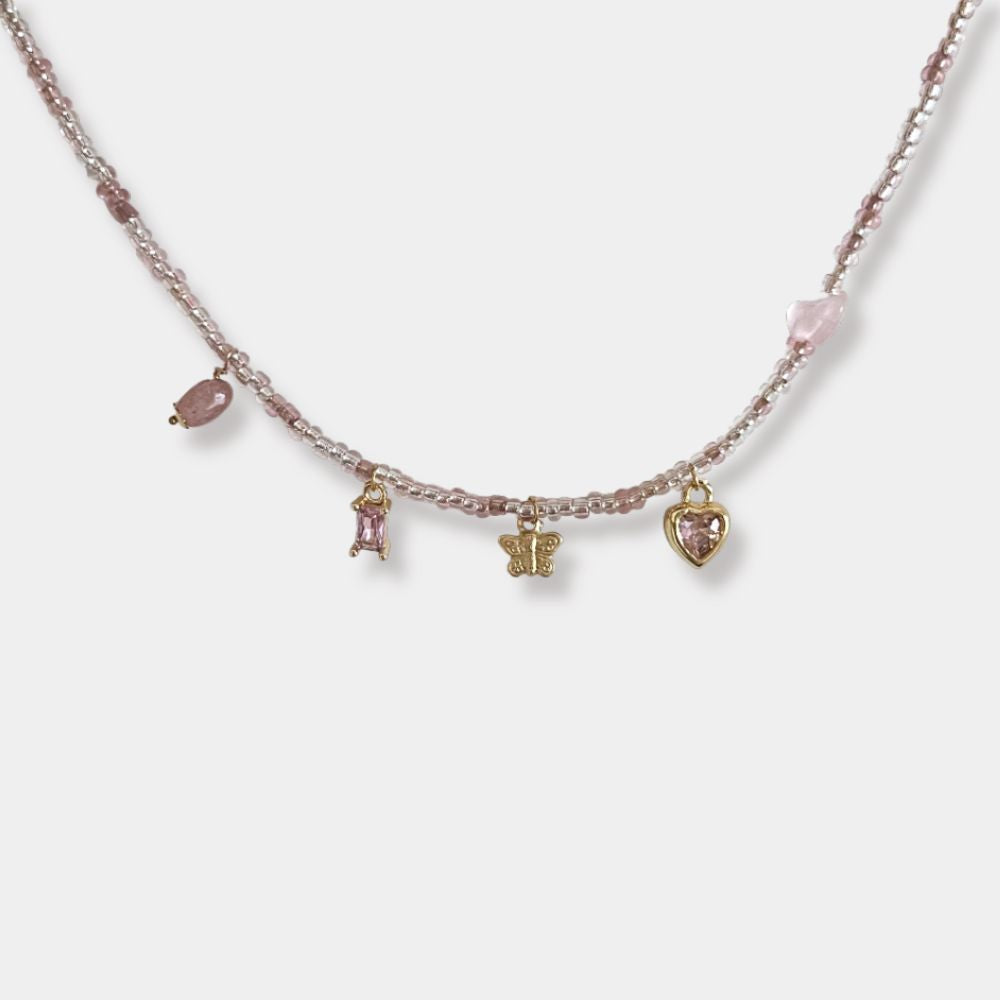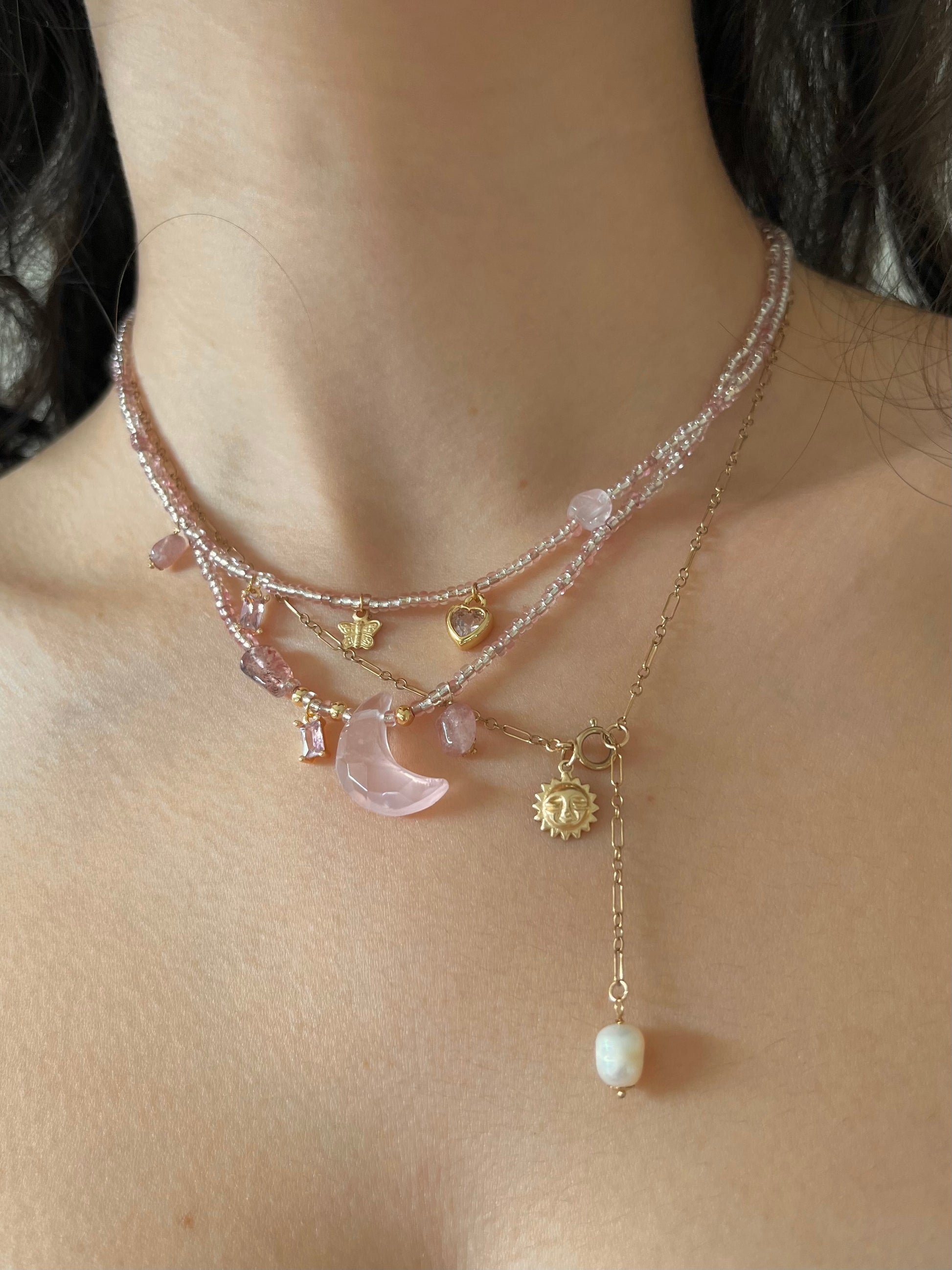 This handmade necklace features a stunning centre piece of strawberry quartz as well as 14k gold filled charms and details. Finished in tarnish resistant, gold plated stainless steel and fine Czech glass beads.