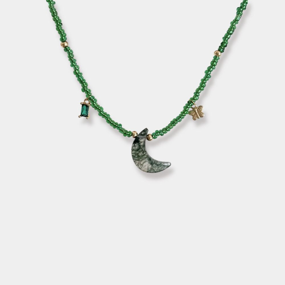 This handmade necklace features 14k gold filled details as well as a stunning moss agate moon centre piece charm. Finished in tarnish resistant, gold plated stainless steel and fine Czech glass beads.