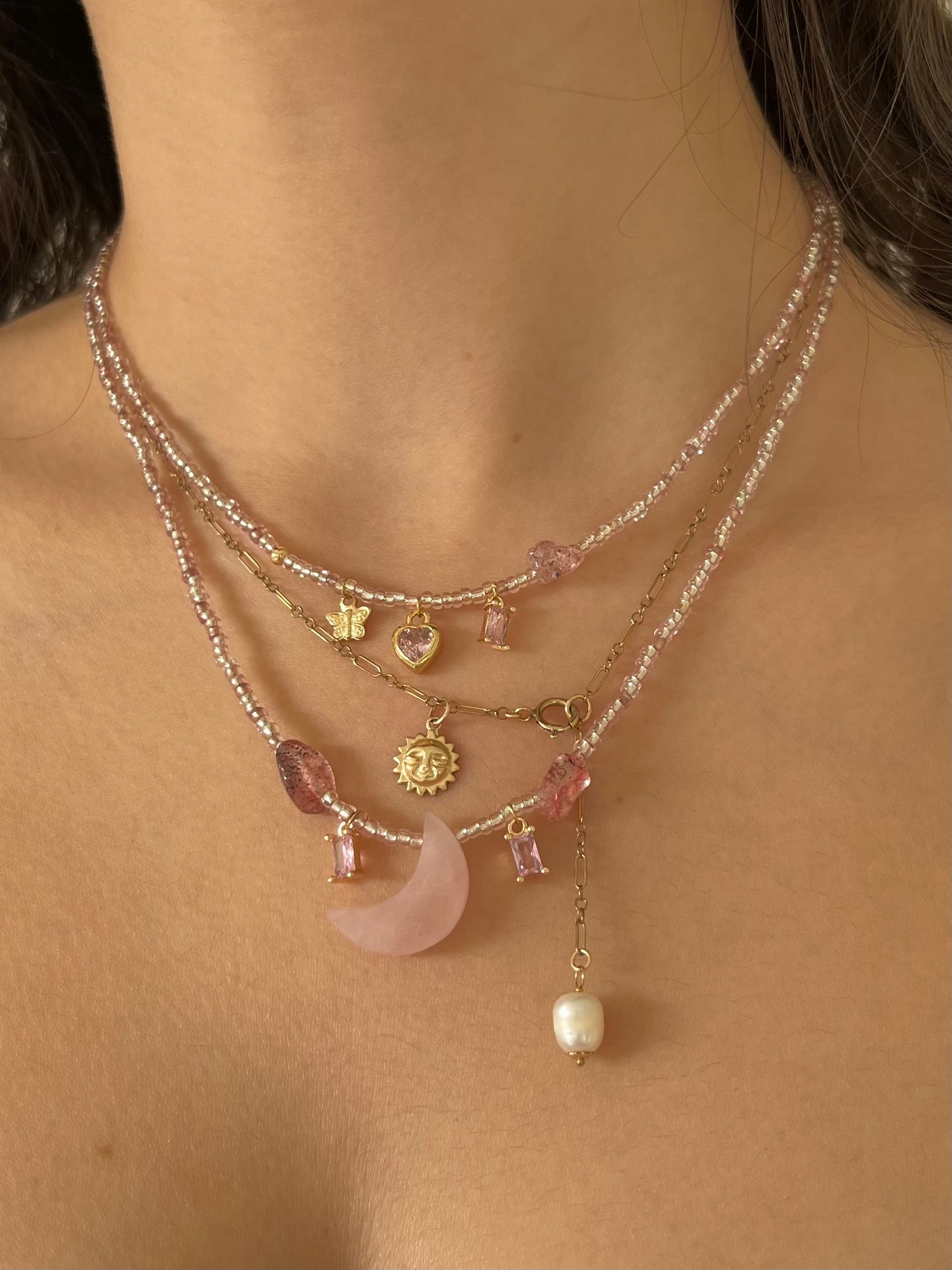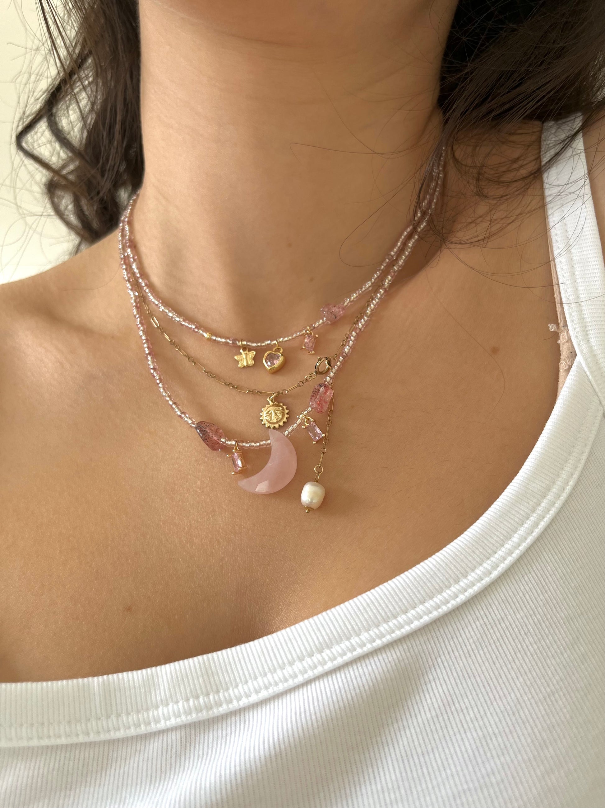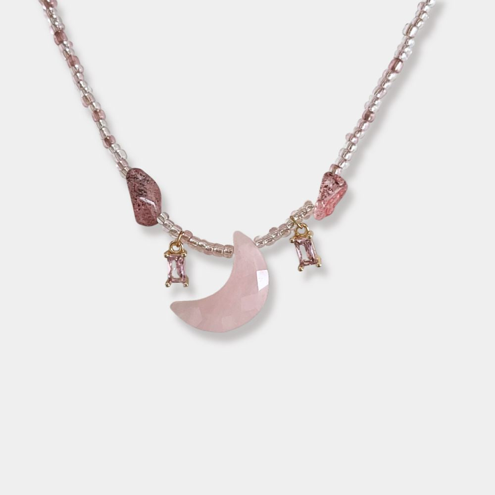 This handmade necklace features 14k gold filled details along with strawberry quartz pebbles and a sparkling faceted rose quartz moon charm as its centre piece. Finished in tarnish resistant, gold plated stainless steel and fine Czech glass beads.