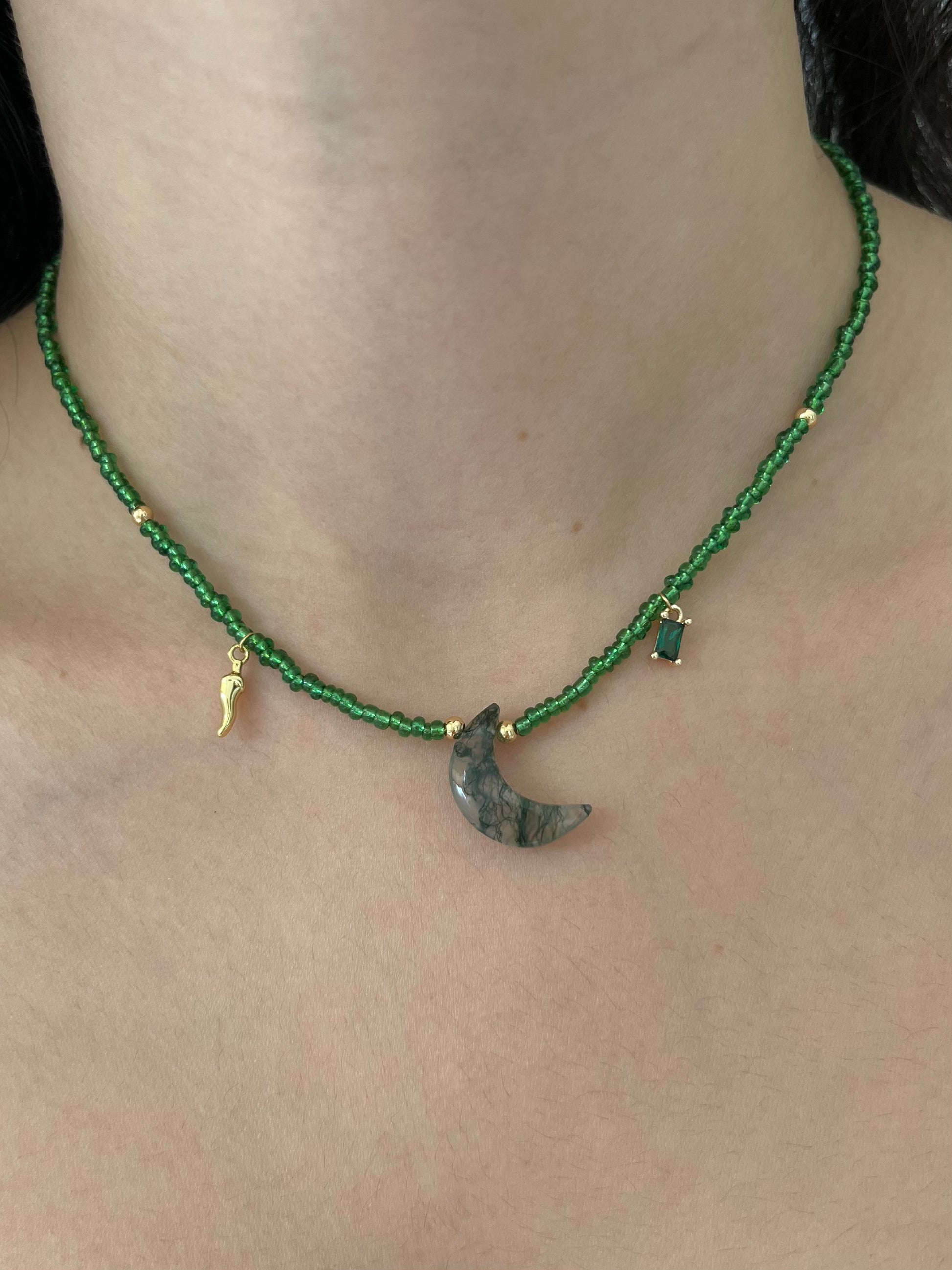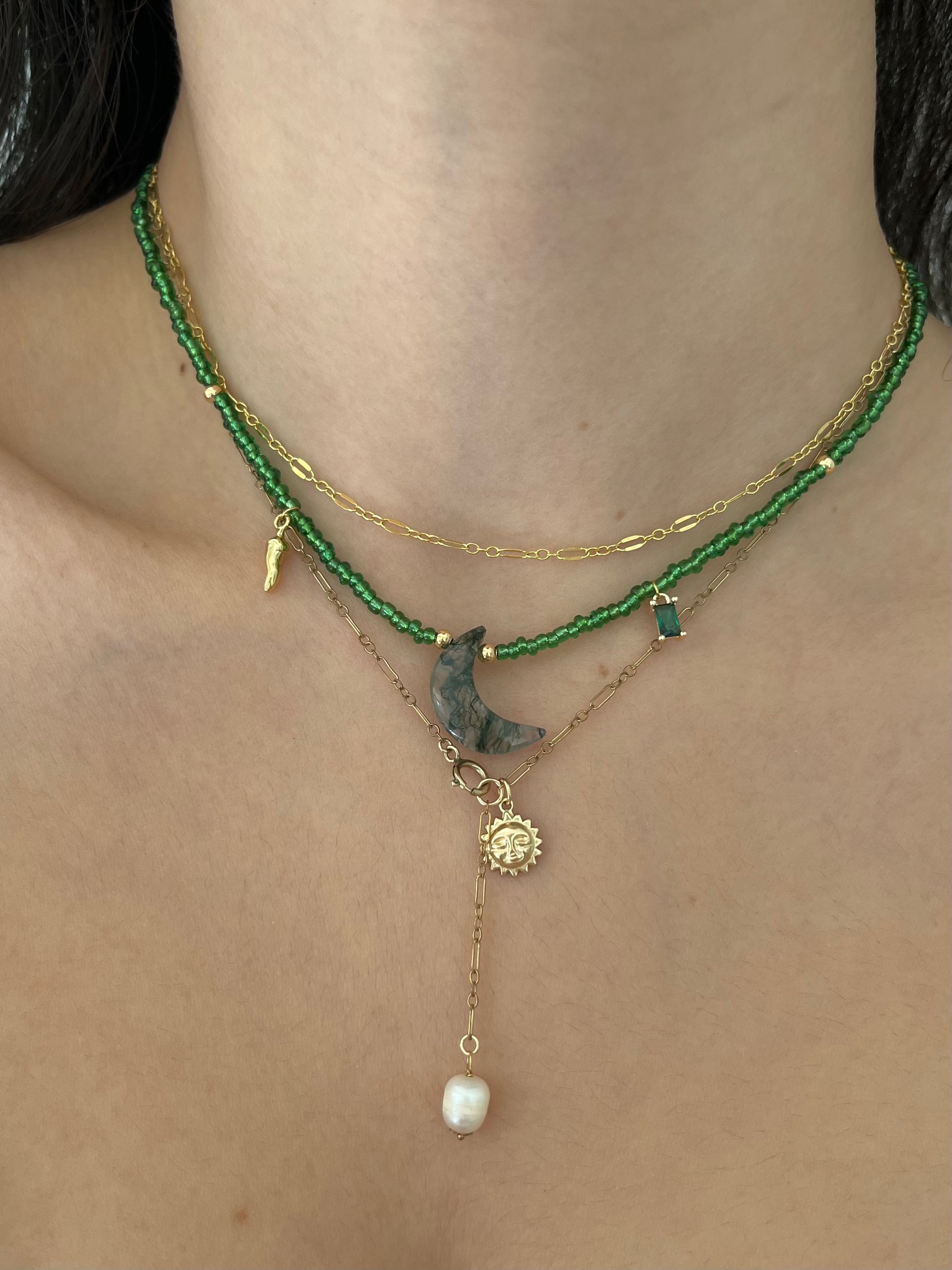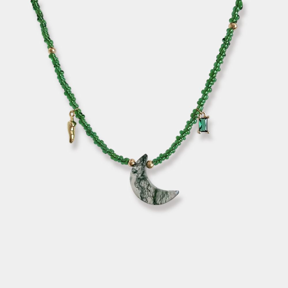 This handmade necklace features 14k gold and plated filled details as well as a stunning moss agate moon centre piece charm. Finished in tarnish resistant, gold plated stainless steel and fine Czech glass beads.