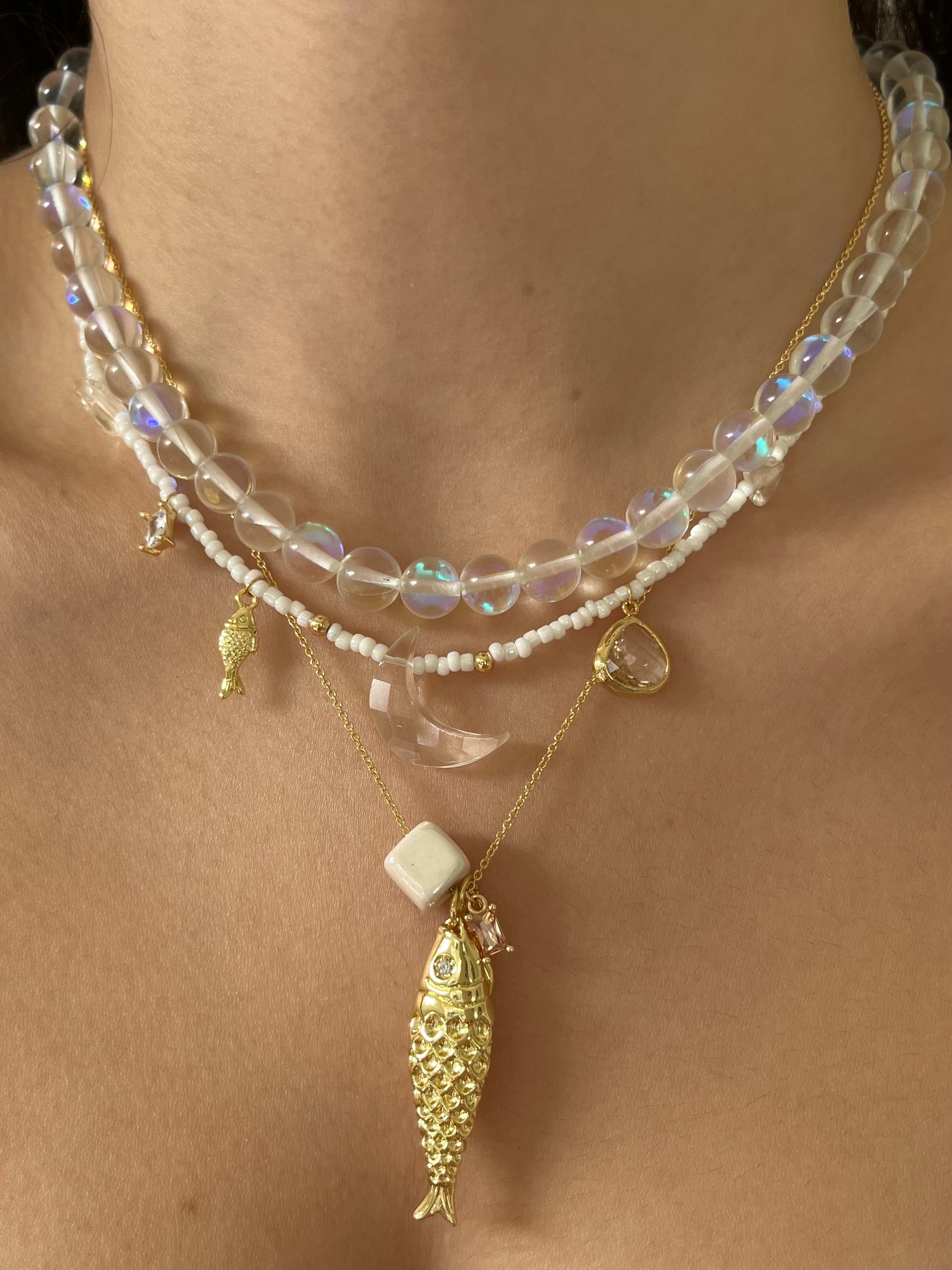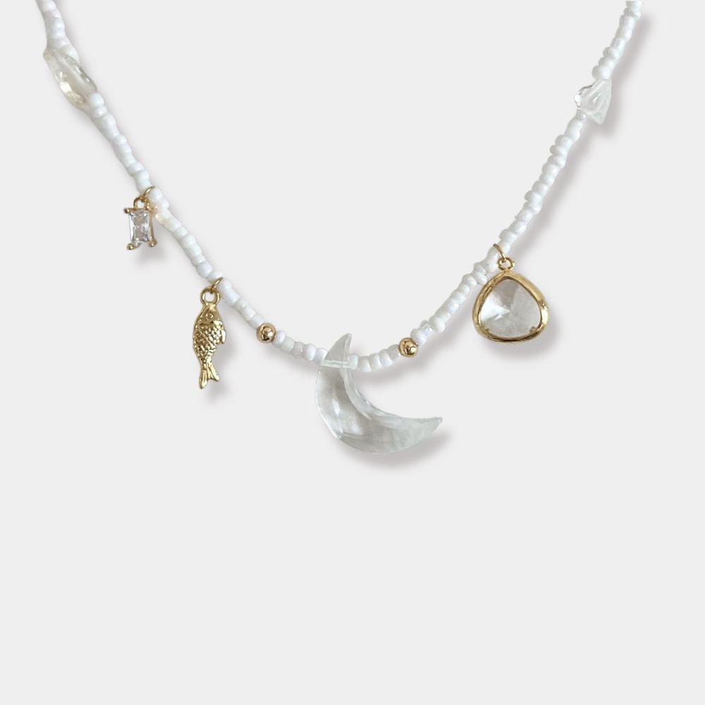 This handmade necklace features 14k gold filled and plated details as well as a sparkling faceted clear quartz moon charm as its centre piece. Finished in tarnish resistant, gold plated stainless steel and fine Czech glass beads.