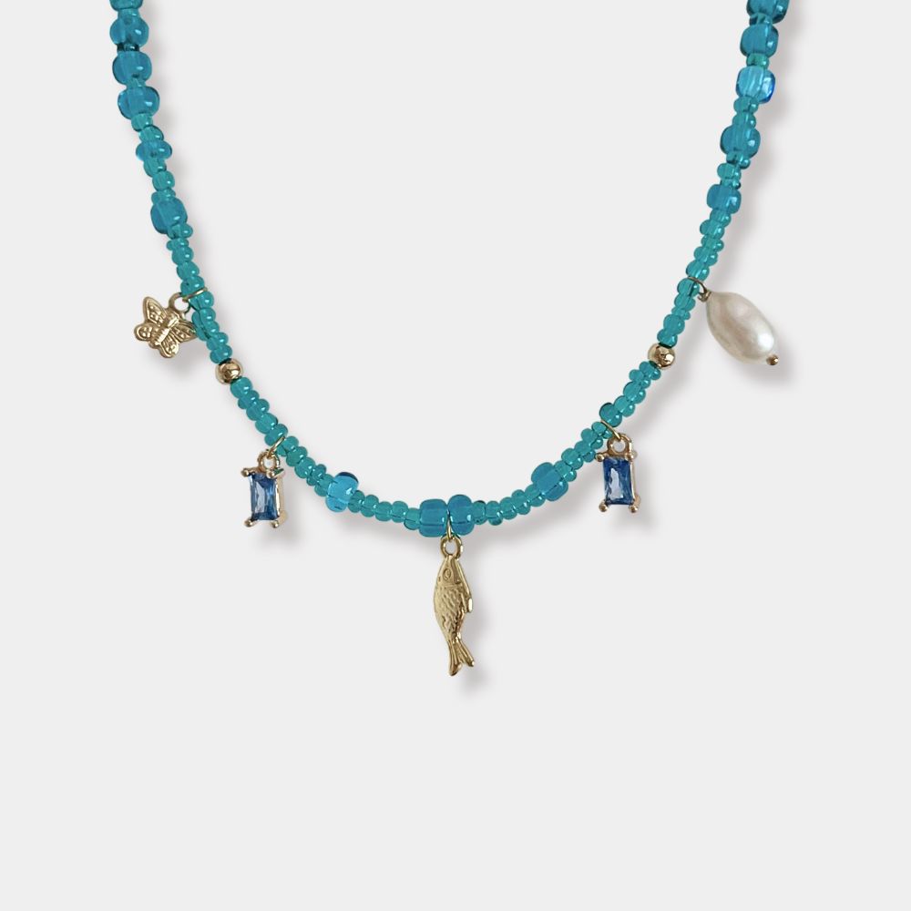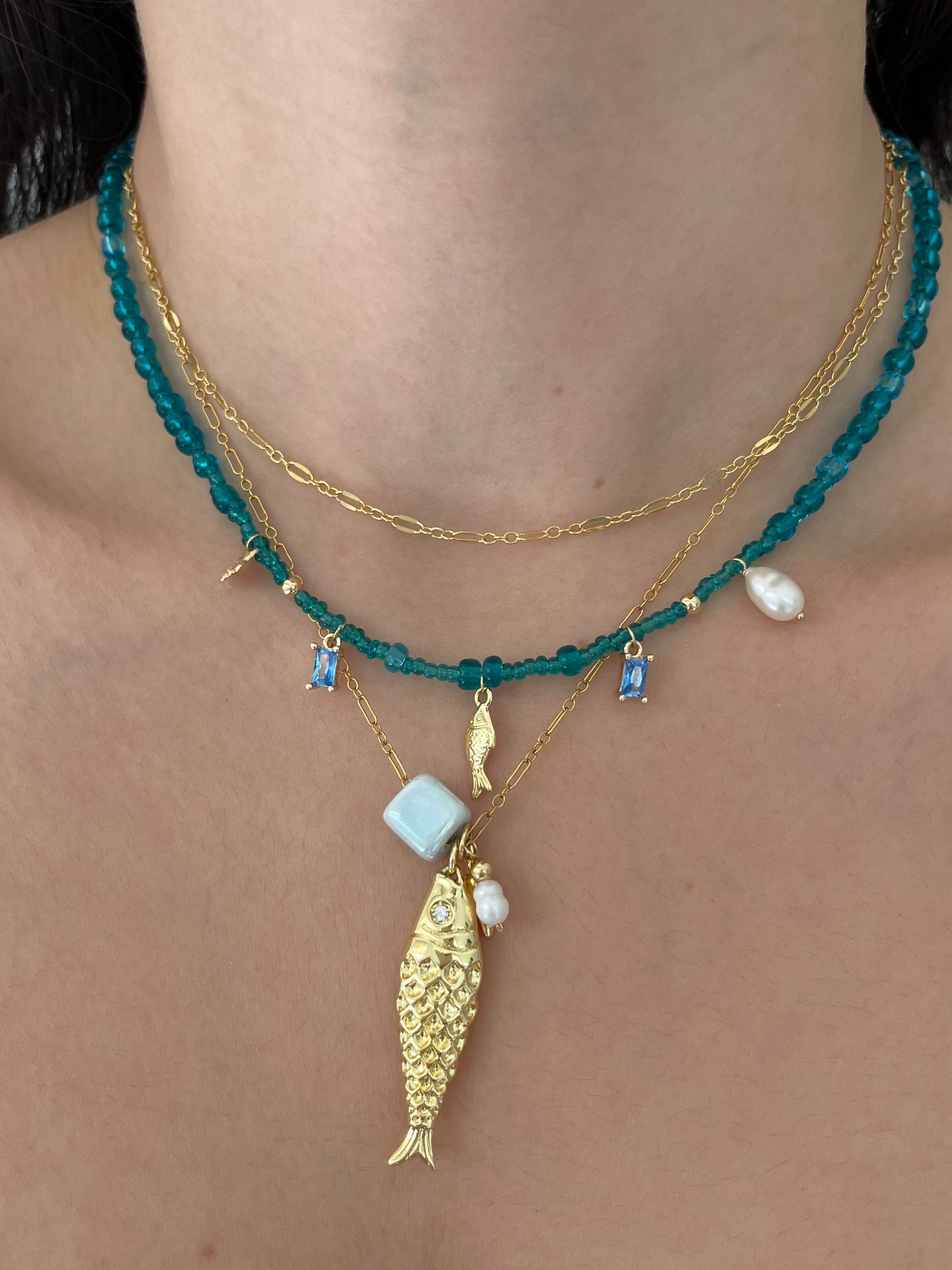 This handmade necklace features gold filled and plated details and an eye-catching, gold plated barbooni fish charm as its centre piece. Finished in tarnish resistant, gold plated stainless steel and fine Czech glass beads.