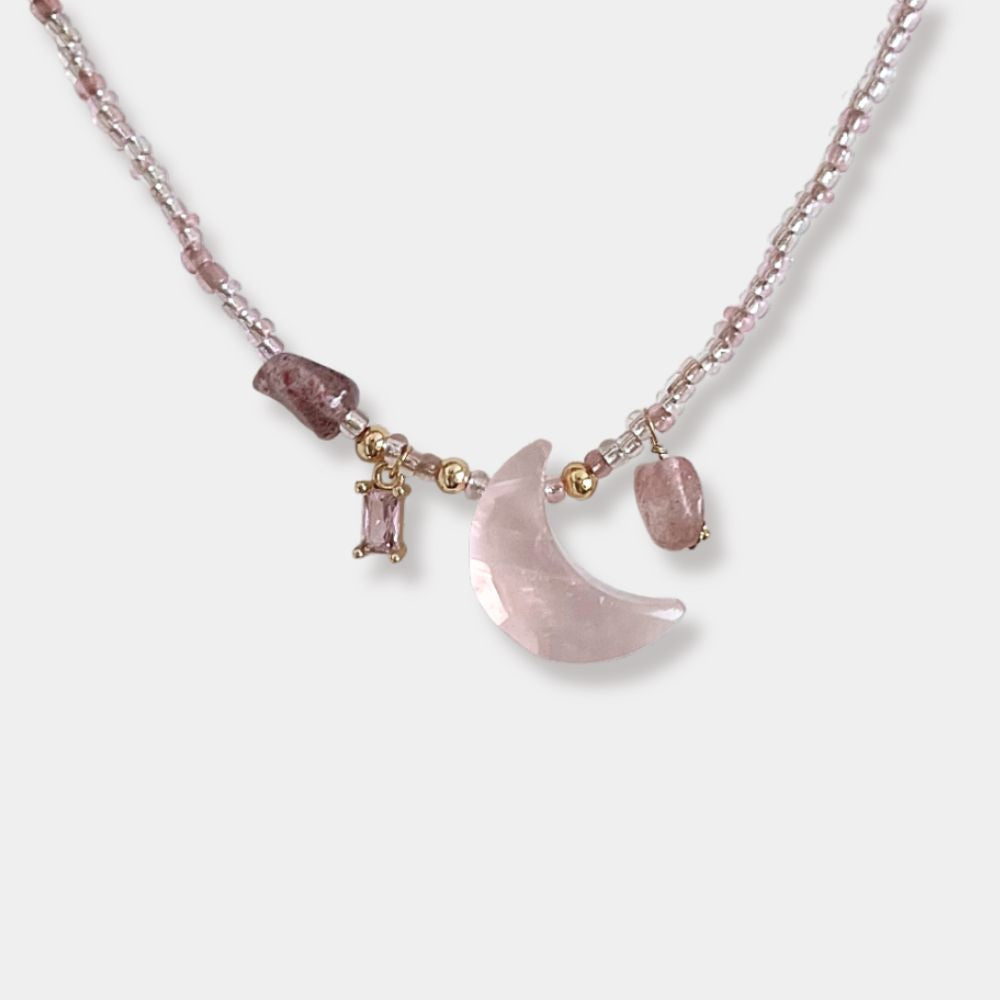 This handmade necklace features 14k gold filled details along with strawberry quartz pebbles and a sparkling faceted rose quartz moon charm as its centre piece. Finished in tarnish resistant, gold plated stainless steel and fine Czech glass beads.