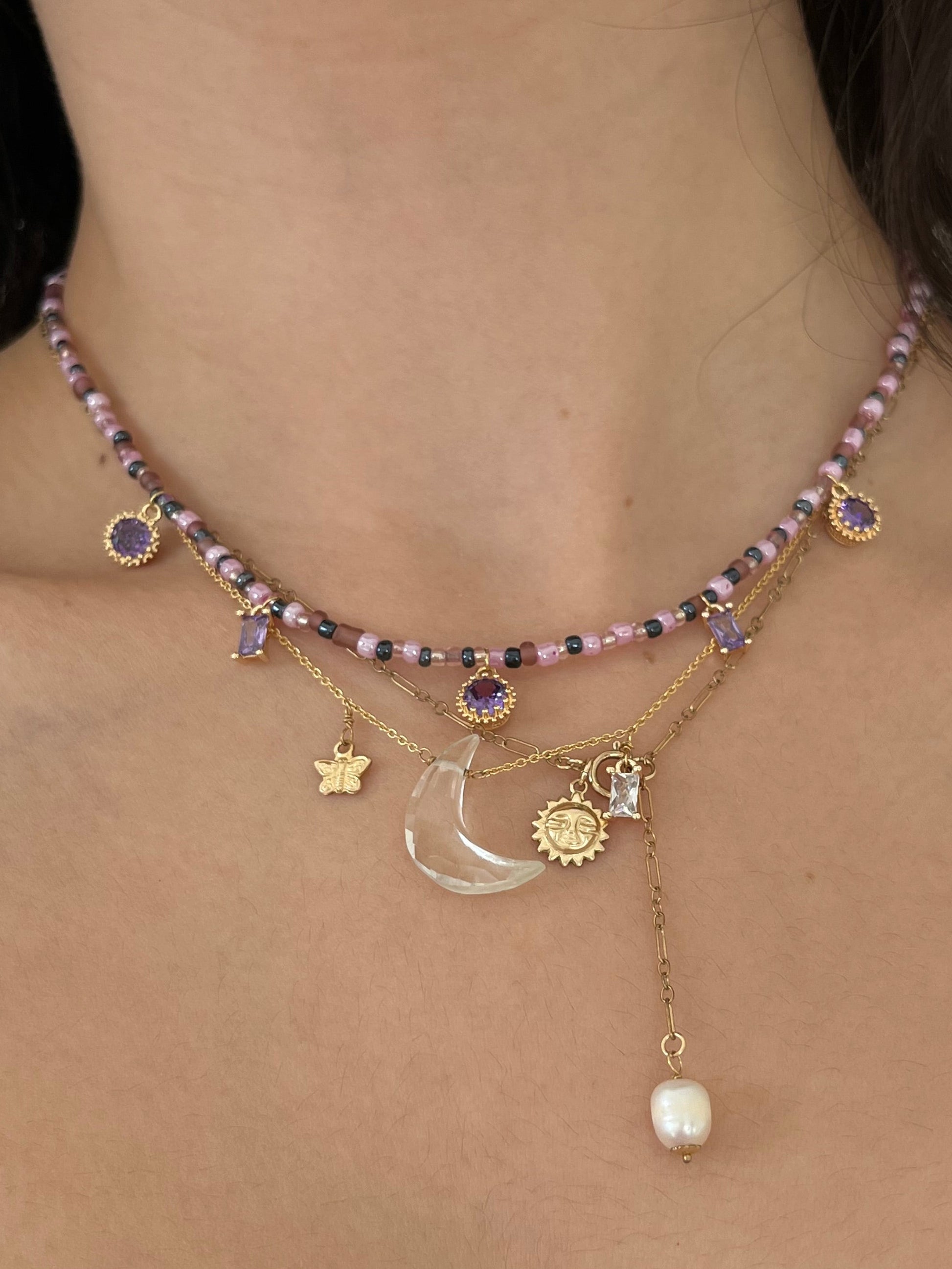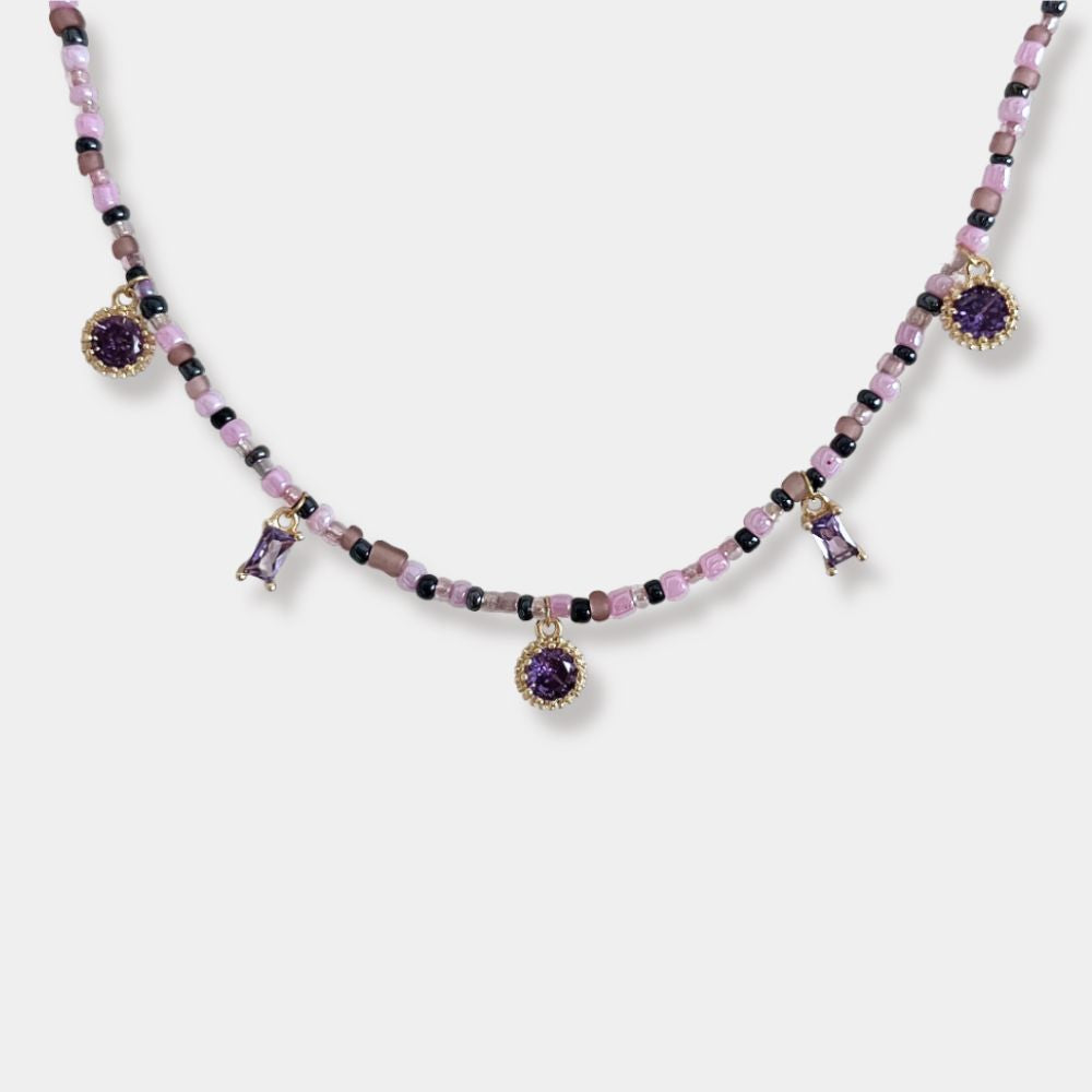 This handmade necklace features an array of 14k gold filled, sparkling amethyst coloured CZ dangles. Finished in tarnish resistant, gold plated stainless steel and fine Czech glass beads.