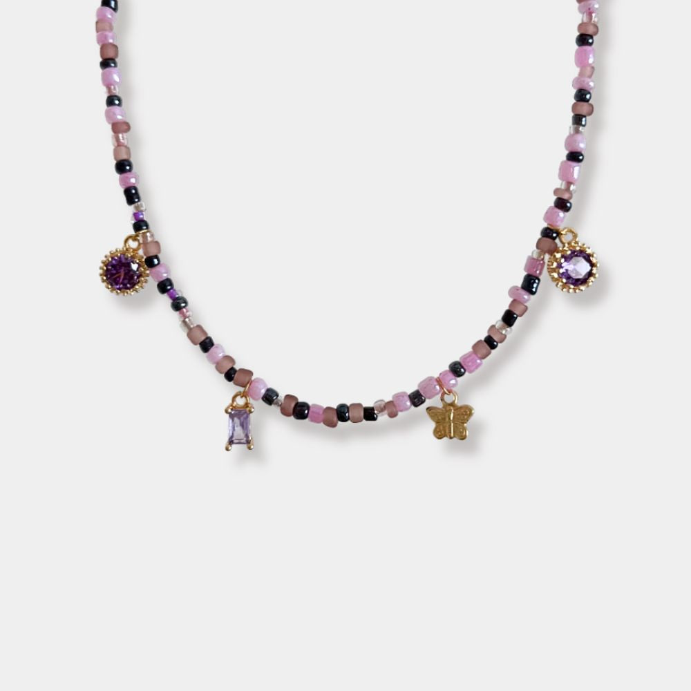 This handmade necklace features an array of 14k gold filled charms, including sparkling amethyst coloured CZ dangles and the sweetest gold filled butterfly charm. Finished in tarnish resistant, gold plated stainless steel and fine Czech glass beads.