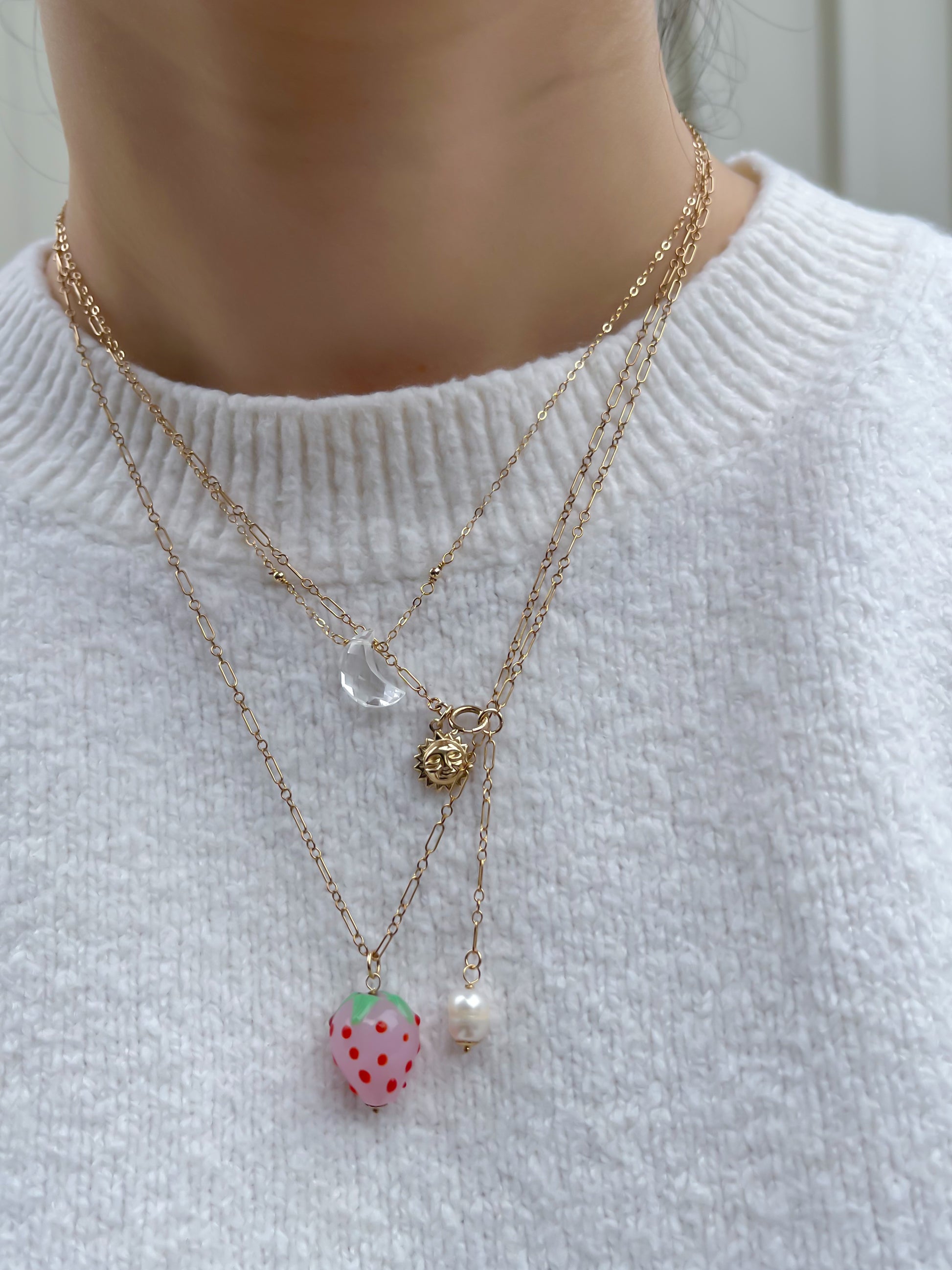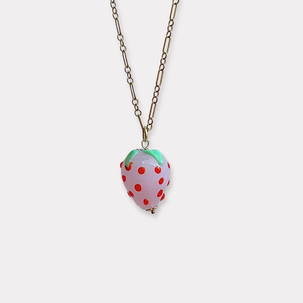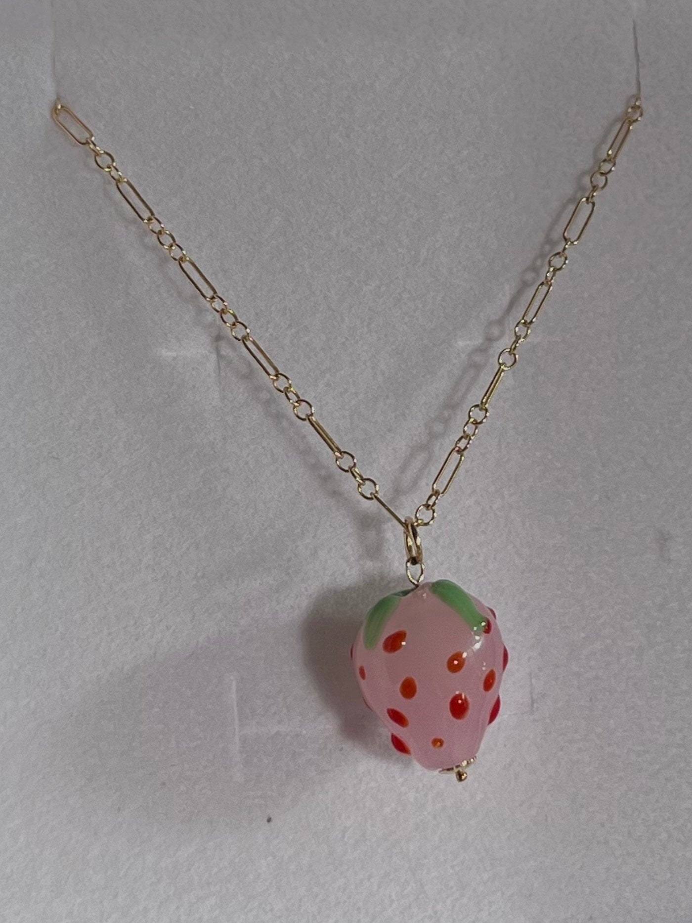 as seen on Pinterest, the piece that captured your hearts is back! This truly unique piece features a 14k gold filled figaro chain with the sweetest glass strawberry pendant, set in 14k gold fill.