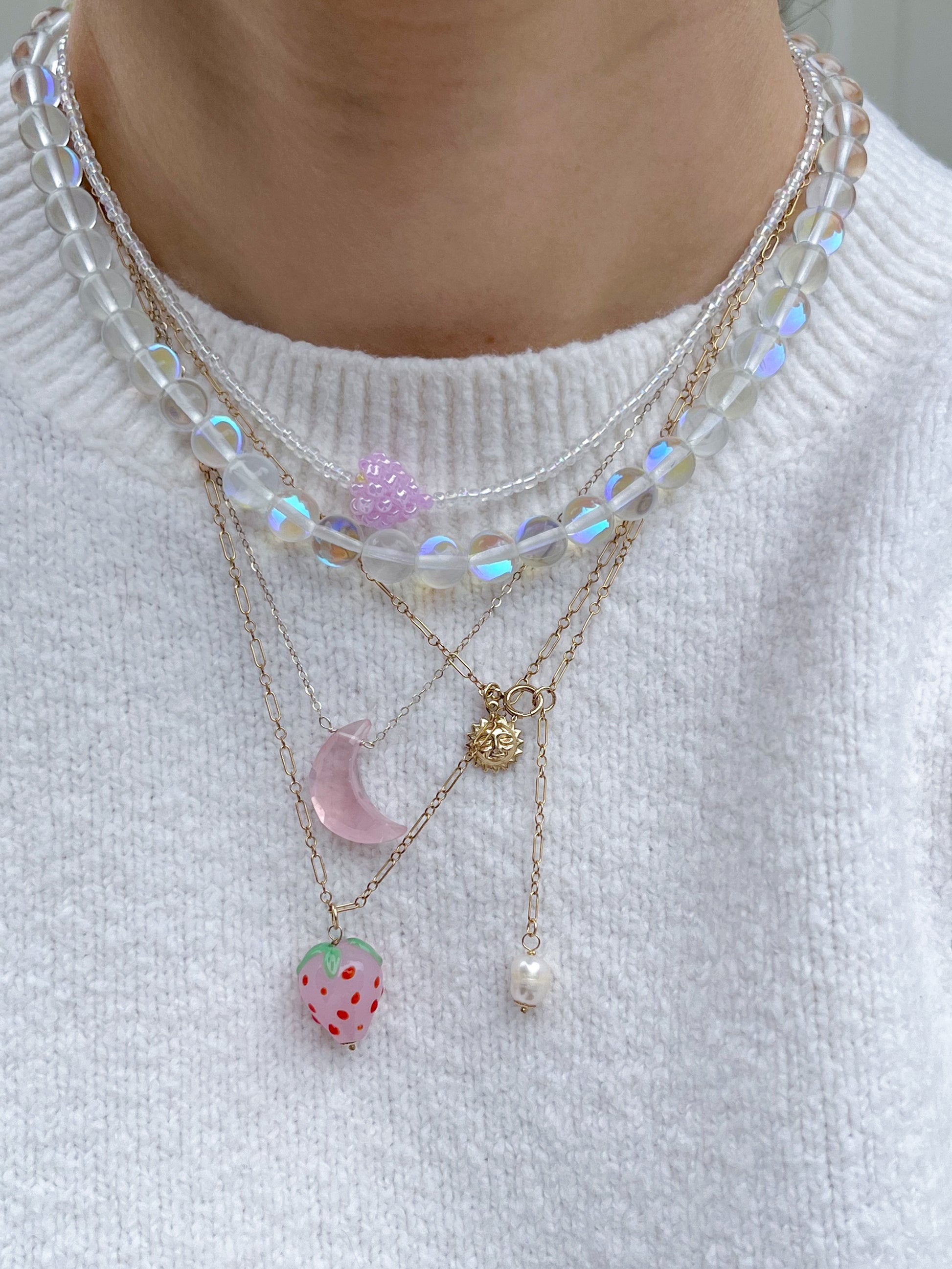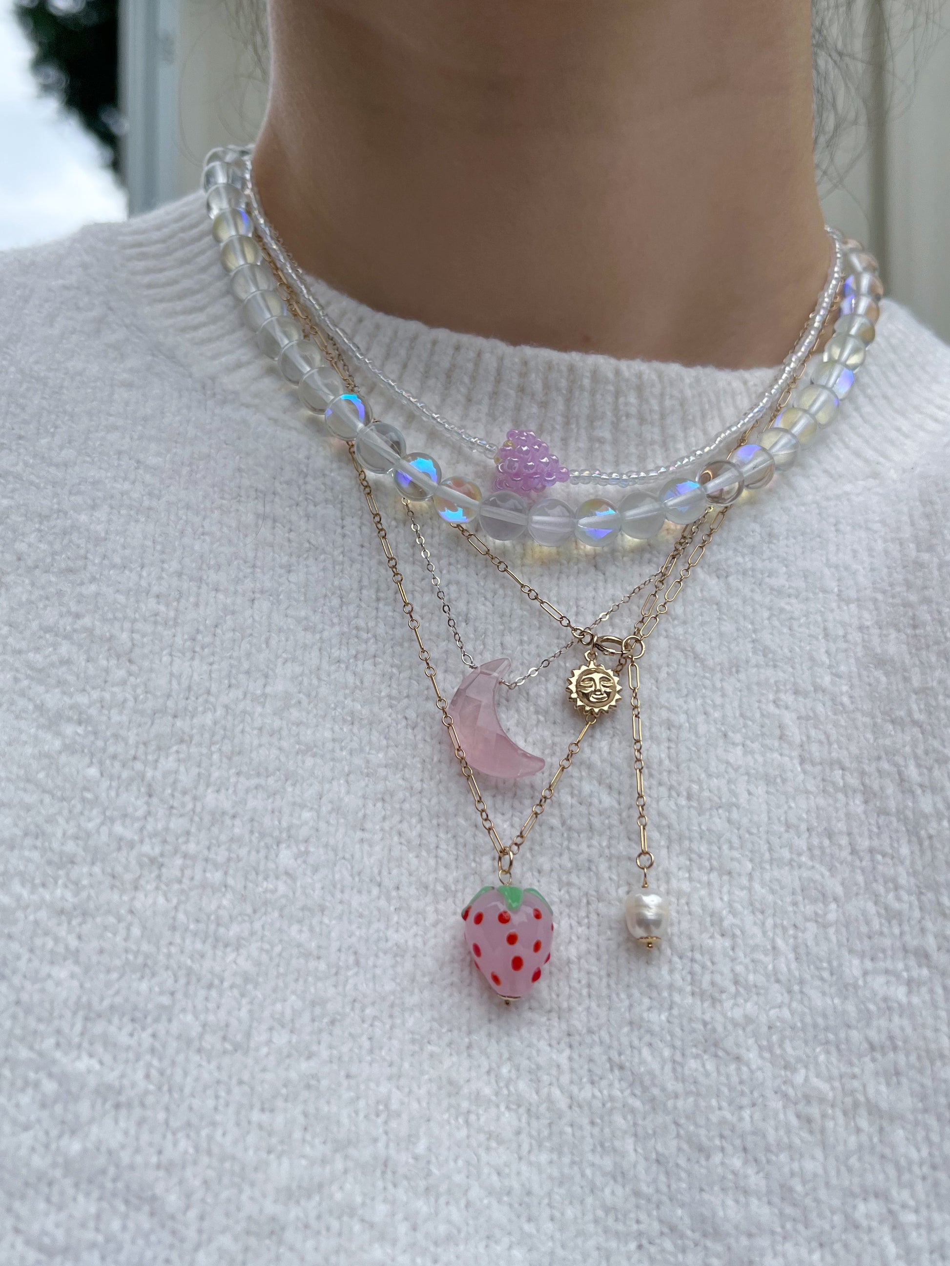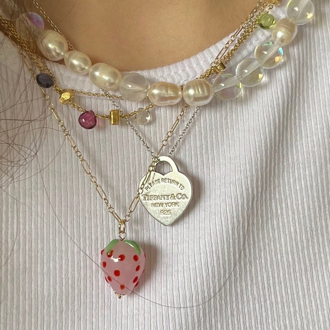 as seen on Pinterest, the piece that captured your hearts is back! This truly unique piece features a 14k gold filled figaro chain with the sweetest glass strawberry pendant, set in 14k gold fill.